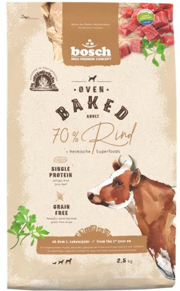 Oven baked Rind enthält mit 70 % Rind, davon 62 % als frisches Rind nur eine tierische Eiweißquelle (single Protein) und wird ohne Getreide hergestellt. Als höchst verdauliche Kohlenhydrate verwenden wir hochwertige Kartoffel.