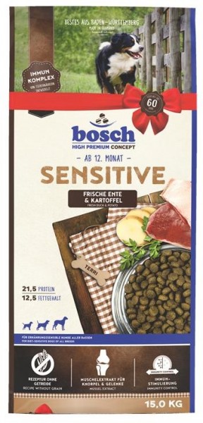 Unser Sensitive Ente & Kartoffel ist ein Alleinfutter für ernährungssensible, ausgewachsene Hunde und enthält als alleinige tierische Proteinquelle frische Ente (30 %) in Kombination mit Entenprotein (getrocknet, 15 %).