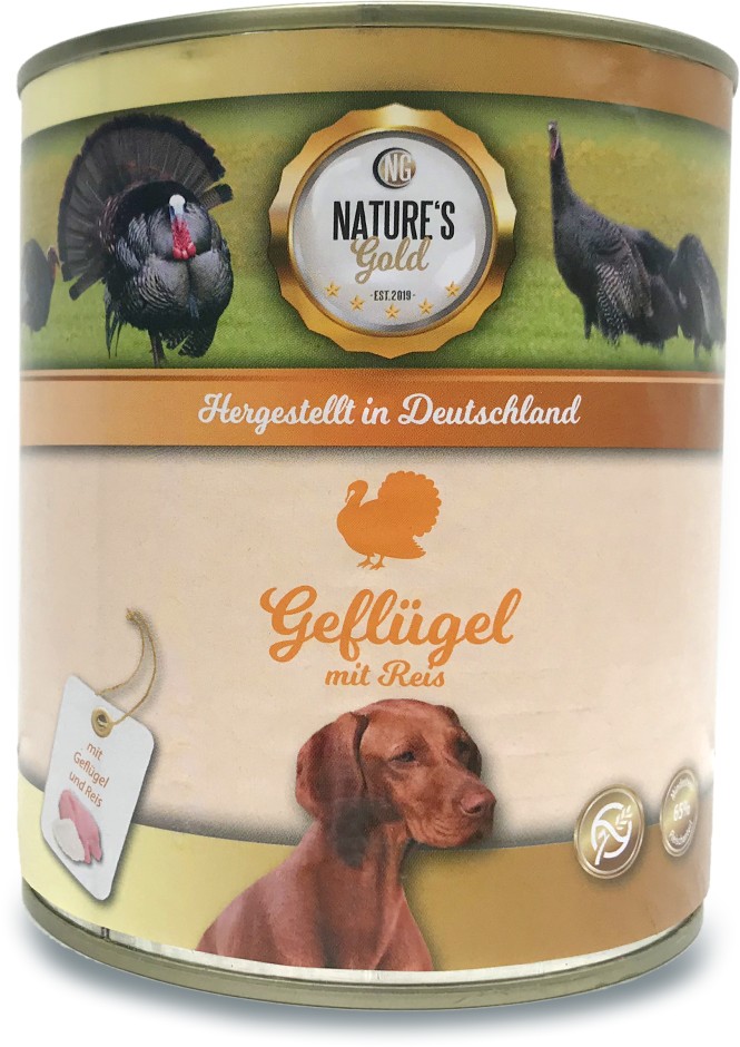 Natures Gold ® mit zarten und schonend zubereiteten Geflügelfleisch & Reis. Dieses Nassfutter für Hunde ist ein besonders qualitatives Alleinfuttermittel für Hunde, dass unter überaus strengen Qualitätsstandards und nur mit deutschen Produkten hergestellt wird.