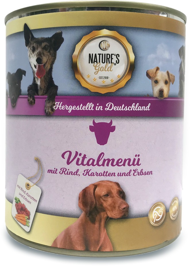 Natures Gold ® Vitalmenü mit leicht verdaulichen & gegarten Karotten & Erbsen in zartem Rinder - & Geflügelfleisch. Dieses Hundenassfutter ist ein äußerst qualitativ hochwertiges Alleinfuttermittel für Hunde, dass unter sehr strengen Qualitätsstandards und nur mit deutschen Produkten hergestellt wird.